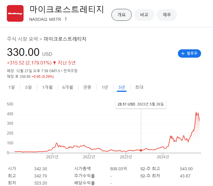 - 비트코인 가격 상승과의 연관성: 2024년 비트코인 가격이 급등하면서 MSTR 주가는 500% 이상의 상승률을 기록했습니다. 이는 비트코인 가격이 상승할 때 마이크로스트래지디가 큰 수익을 얻을 수 있는 구조를 보여줍니다.